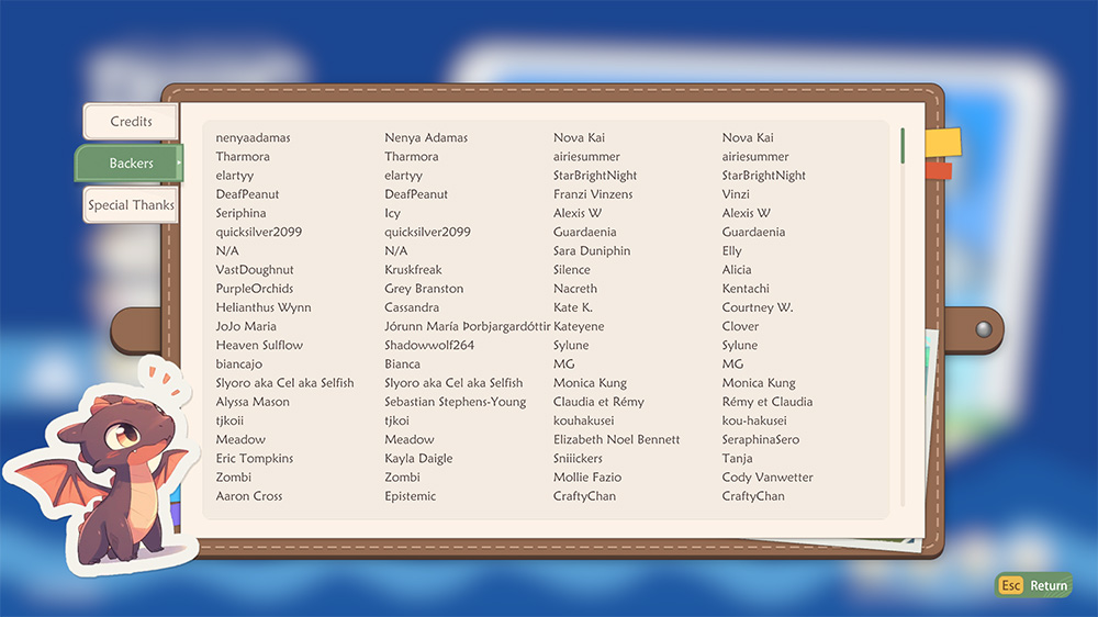 We have completed the delivery of the “Name in Credits” reward for all backers who filled out the Kickstarter survey after the game’s release.